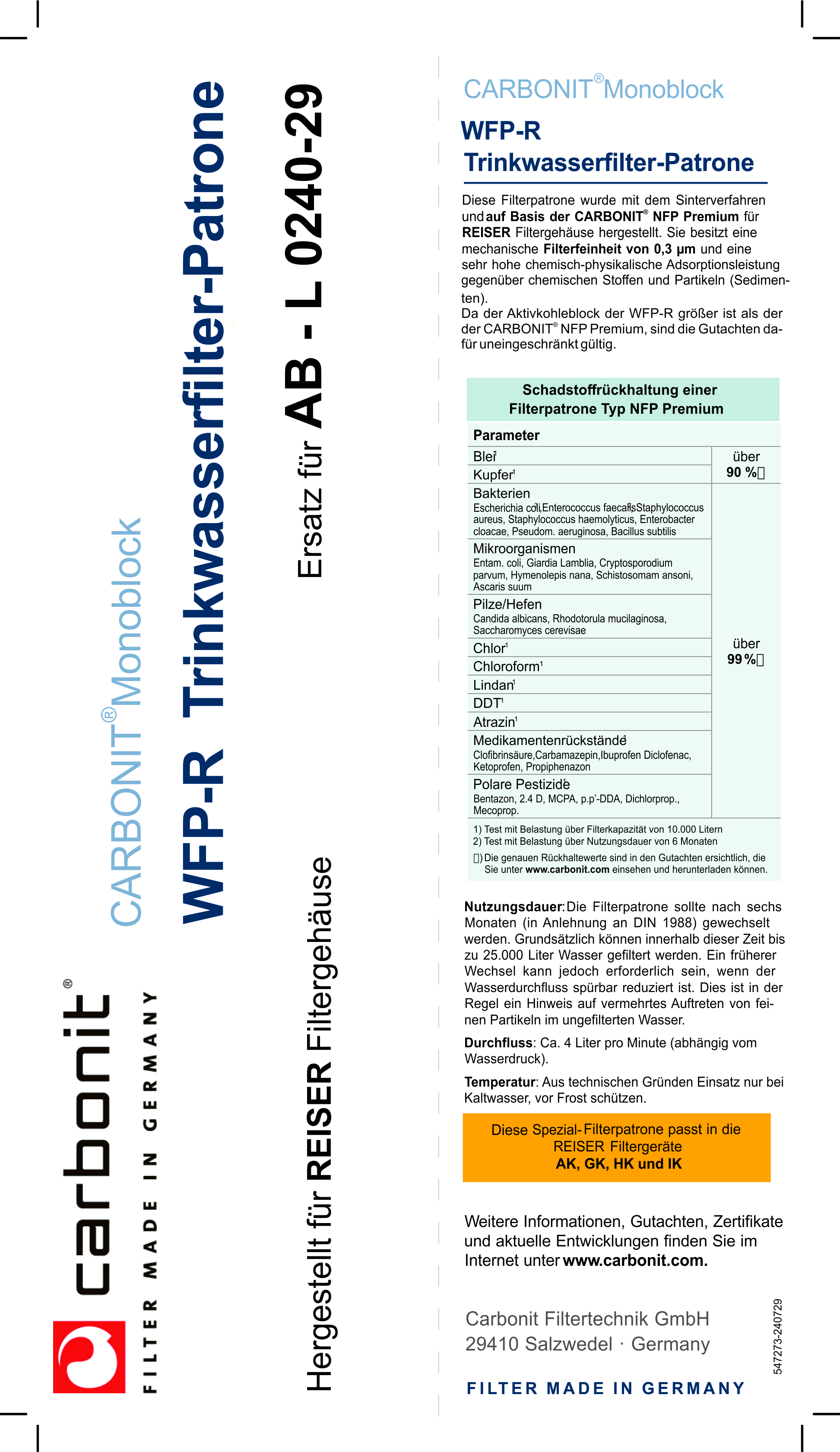 Datenblätter & Infos "0,3 µ Kohlefilter, für Reiser Untertisch Filtergehäuse, 29mm Nippel, 20 Zoll"