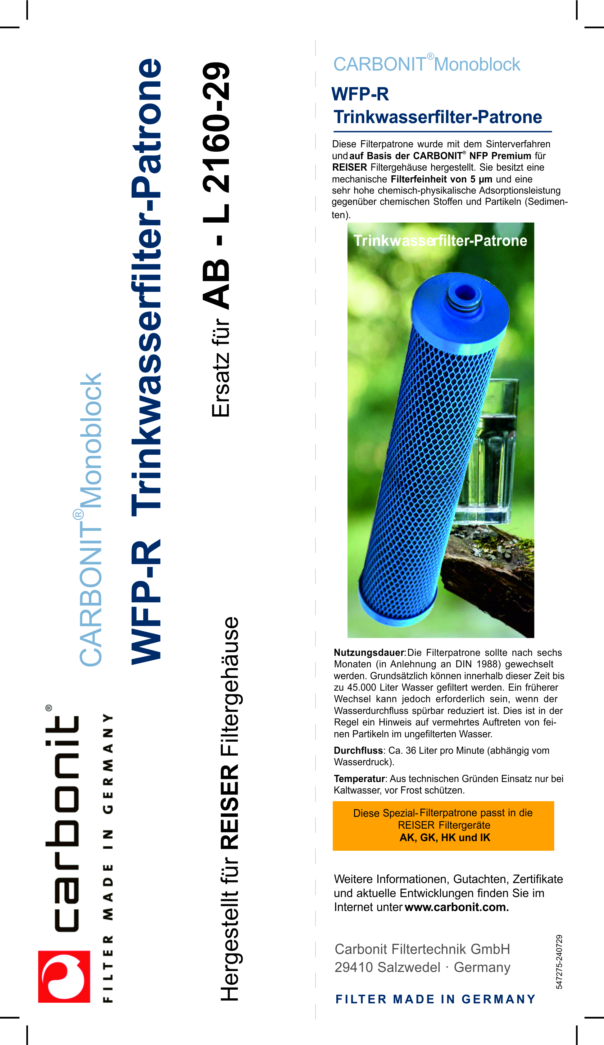 Datenblätter & Infos "5µ Kohlefilter, für Reiser Untertisch Filtergehäuse, 29mm Nippel, 20 Zoll"